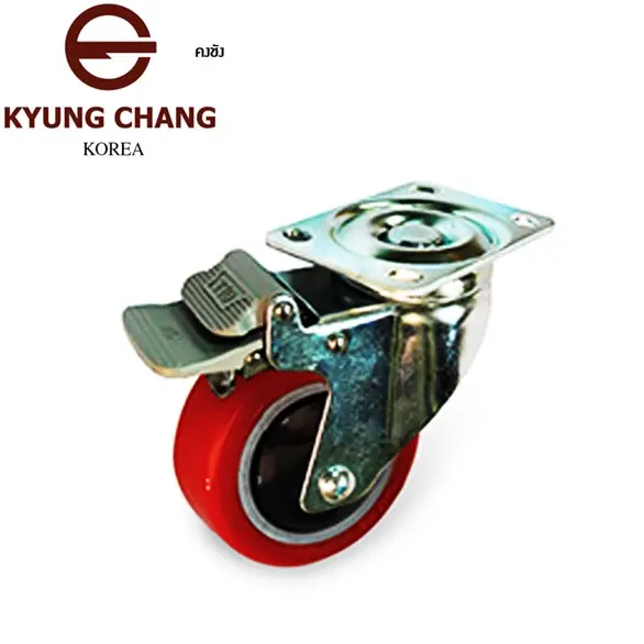 ลูกล้อพียู สีแดง ชนิด แป้นหมุนพร้อมเบรคหลัง Total Lock ขนาด 3″- 5″