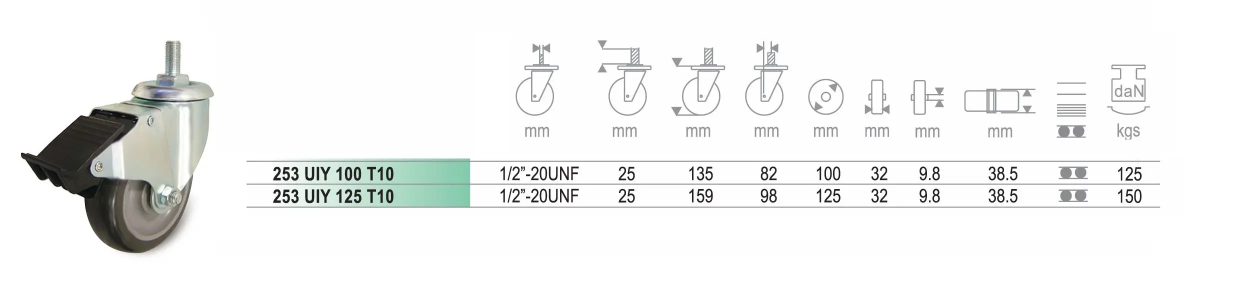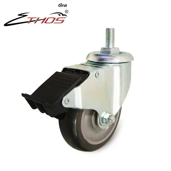ลูกล้อพียู สีเทา ชนิด เกลียมหมุนมีเบรค ขนาด 4″- 5″