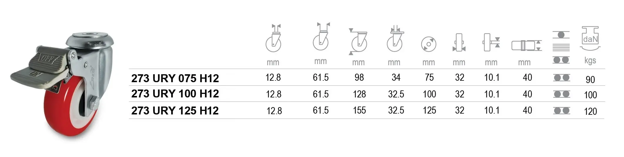 ลูกล้อพียู สีแดง ชนิด ขารู หมุนมีเบรค Hole Fitting with Brake 12.8mm ขนาด 3″- 5″