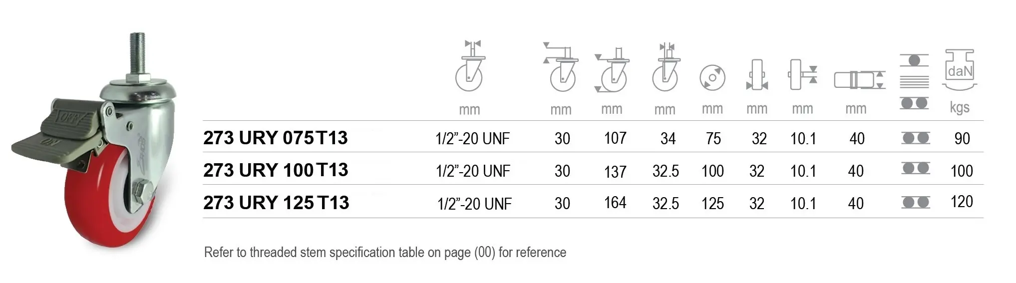 ลูกล้อพียู สีแดง ชนิด เกลียวหมุนมีเบรค T13 ขนาด 3″- 5″