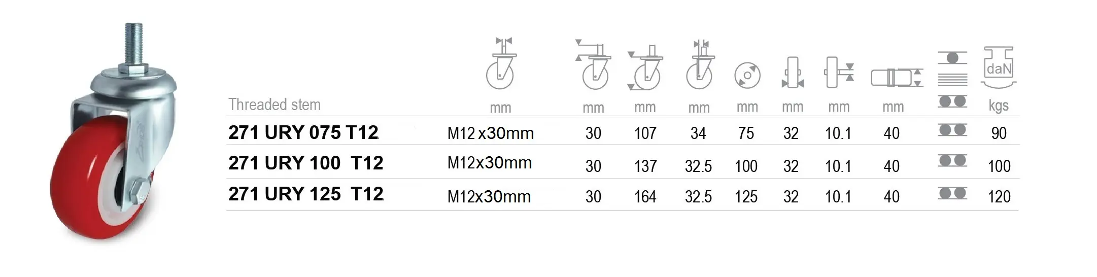 ลูกล้อพียู สีแดง ชนิด เกลียวหมุน T12 ขนาด 3″- 5″