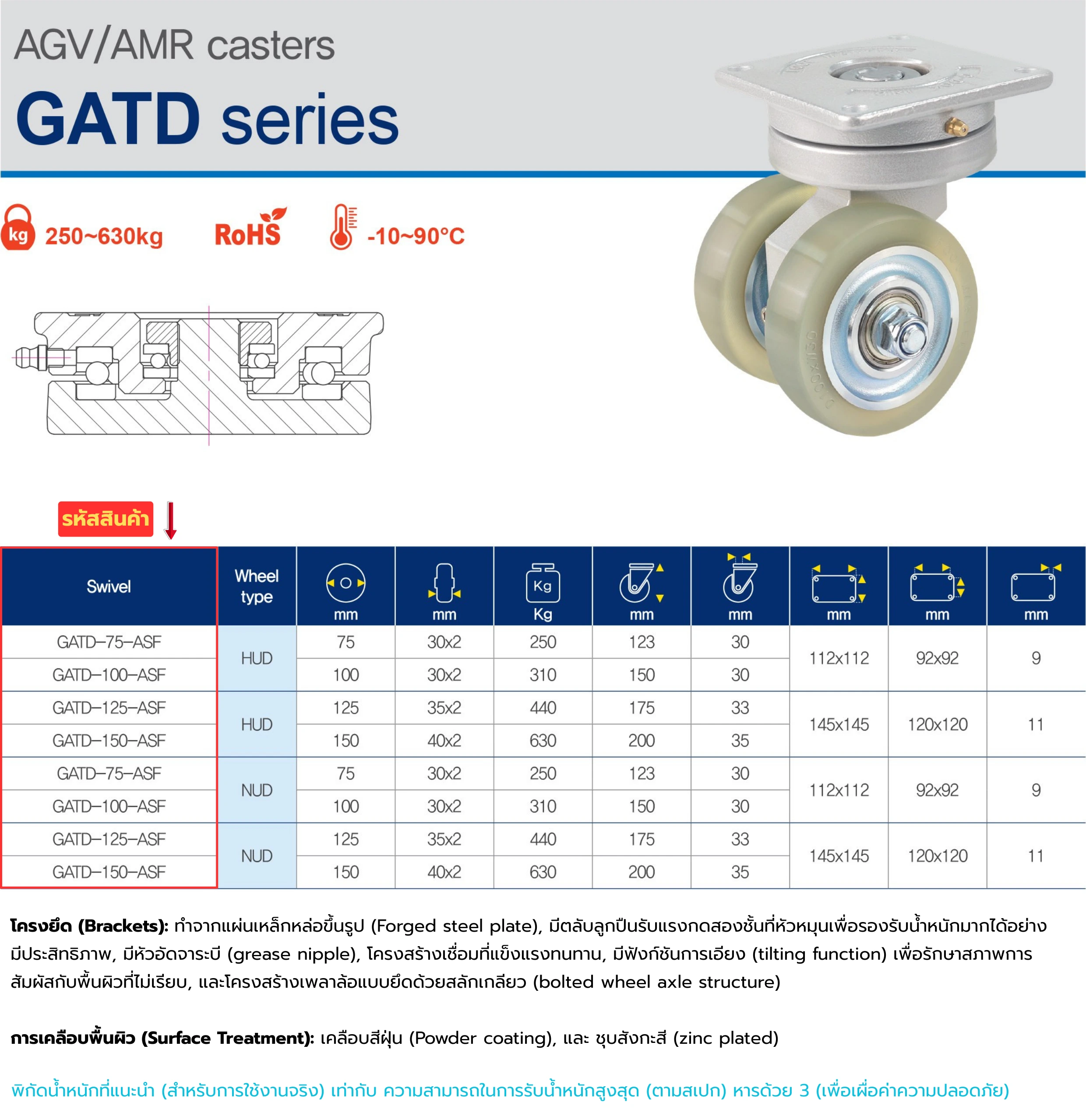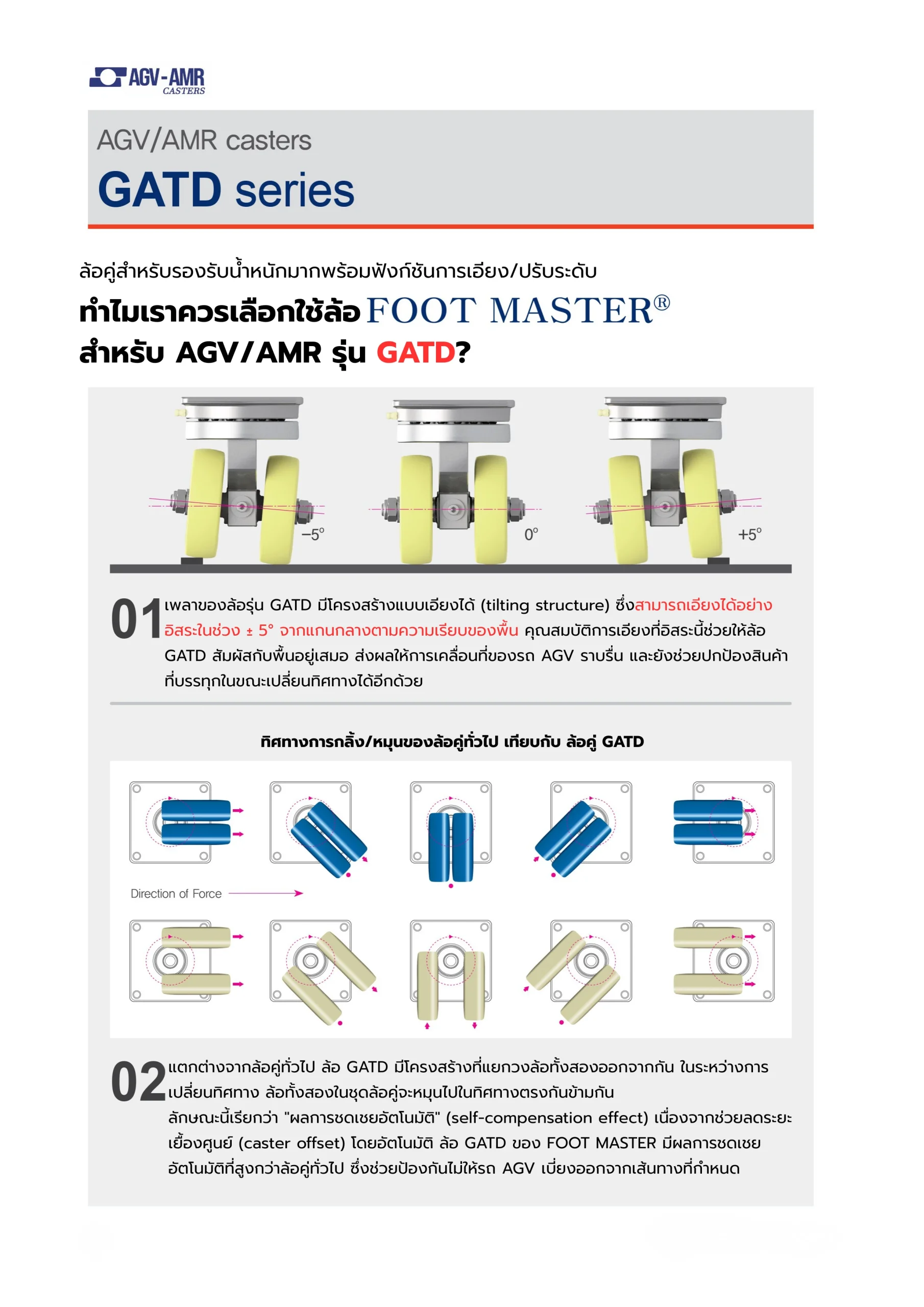 ล้อ AGV รุ่น GATD มีโครงสร้างเพลาแบบเอียงได้ (Tilting Structure) ในช่วง ± 5° ช่วยให้ล้อทั้งสองสัมผัสพื้นตลอดเวลาแม้บนพื้นผิวที่ไม่เรียบ ลดปัญหาการเสียสมดุลและการหยุดกะทันหันขณะเปลี่ยนทิศทาง มีผลการชดเชยอัตโนมัติ (Self-compensation) ช่วยลดระยะเยื้องศูนย์ เหมาะสำหรับ AGV/AMR ที่ต้องการความมั่นคงสูงสุด