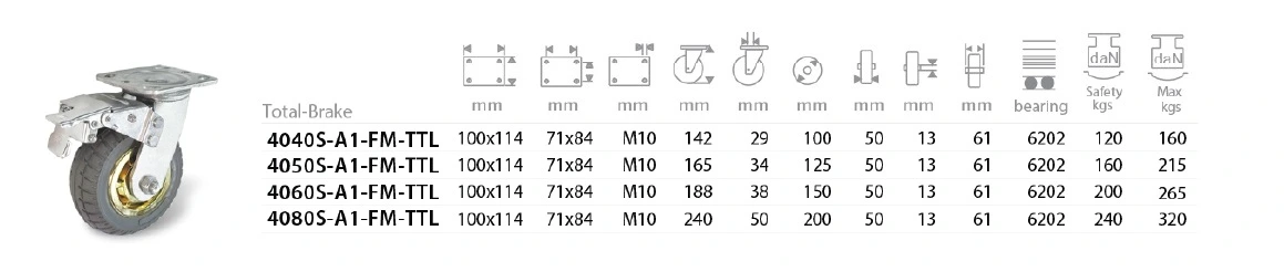 การรับน้ำหนัก : 160 – 320 กก./ล้อ (ขึ้นอยู่กับขนาดของล้อ)