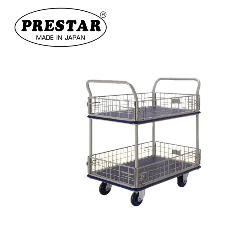 รถเข็นพื้นเหล็ก 2 ขั้น ขอบตะแกรงรอบด้าน รองรับน้ำหนักได้ถึง 300 กิโลกรัม โครงสร้างแข็งแรง พื้นเคลือบยางกันลื่น พร้อมขอบยางกันชนรอบคัน